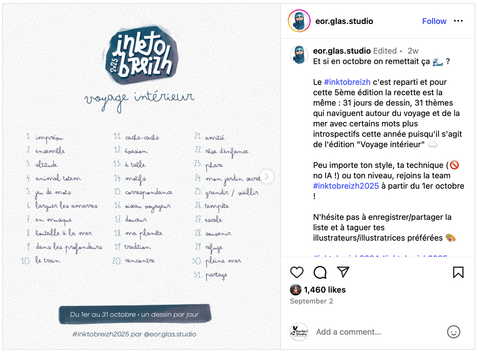 And finally, taking part in Breizhtober 🎉: this is an art challenge inspired by Inktober (one drawing per day throughout October, based on prompts). I took part last year, but this time the official prompts inspired me less. So I chose the list created by Eor Glass (see the post here), centered on inner journeys, with the freedom to use watercolor, paint, digital media… It’s going to be a rush, but I know I’ll love it 🤩